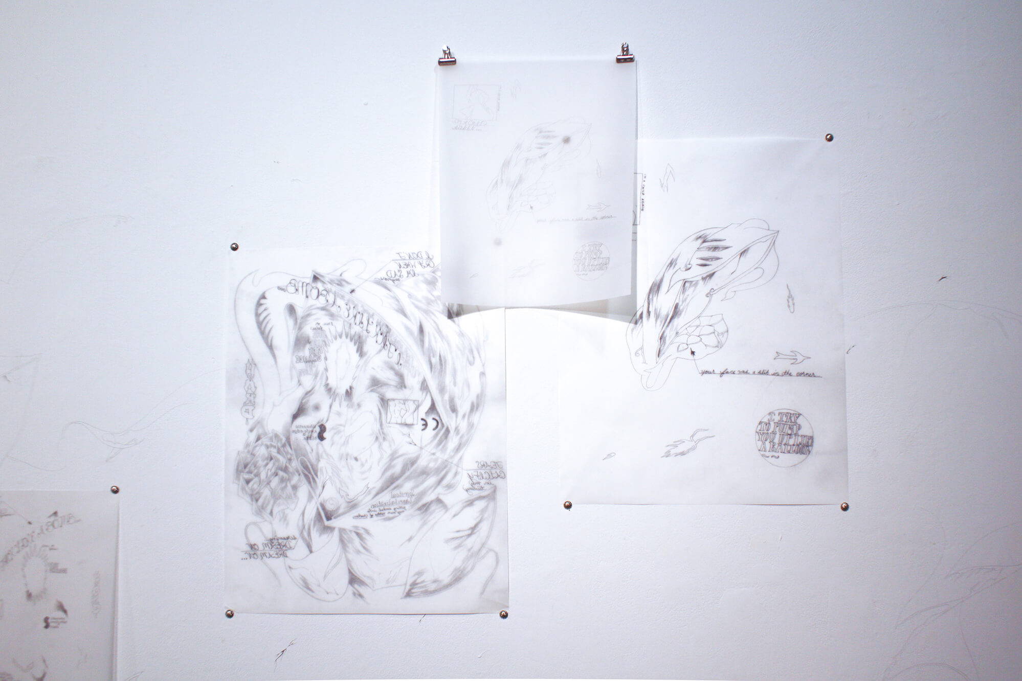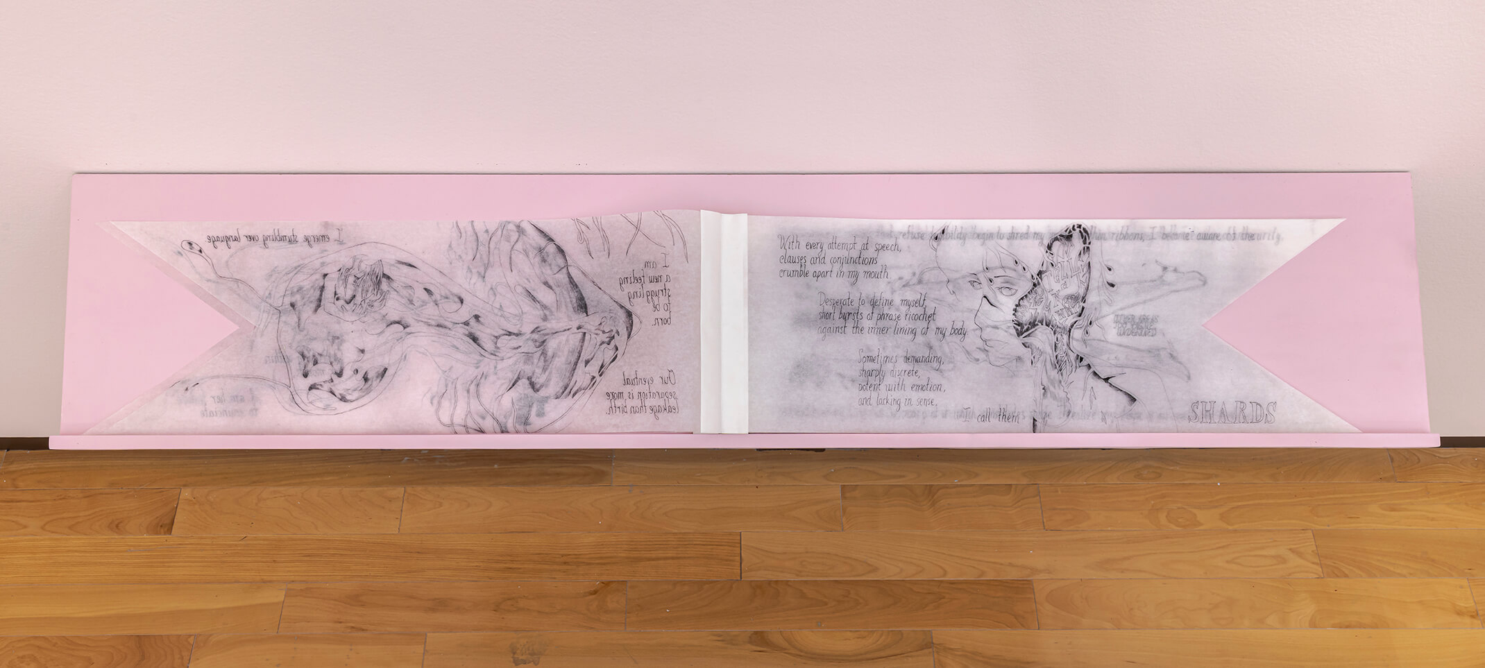 Artist Statement: Hood is an exploration of shifting interiorities via mechanical pencil on heavy vellum. The competing visual languages of biological diagrams, print ephemera tracings, and other collaged pieces are folded together in a knight's helmet. This reflective suit of armour serves as a casing for ecosystems of thought teeming beneath the surface. Scraps of text are sourced from Perfume Genius and Fiona Apple song lyrics, original writing, found poetry, as well as portions of Irum's text, on the swallow, and her belly. How many rocks harbour secret ecologies underneath? What delineates inside and outside? What separates you and I?