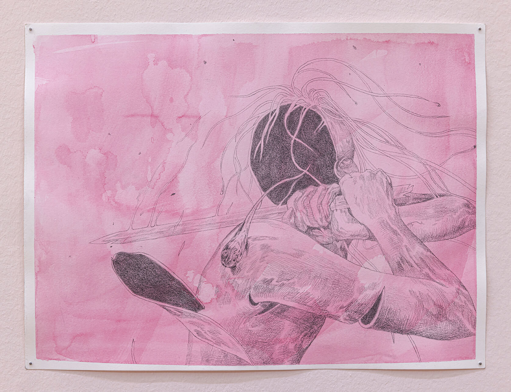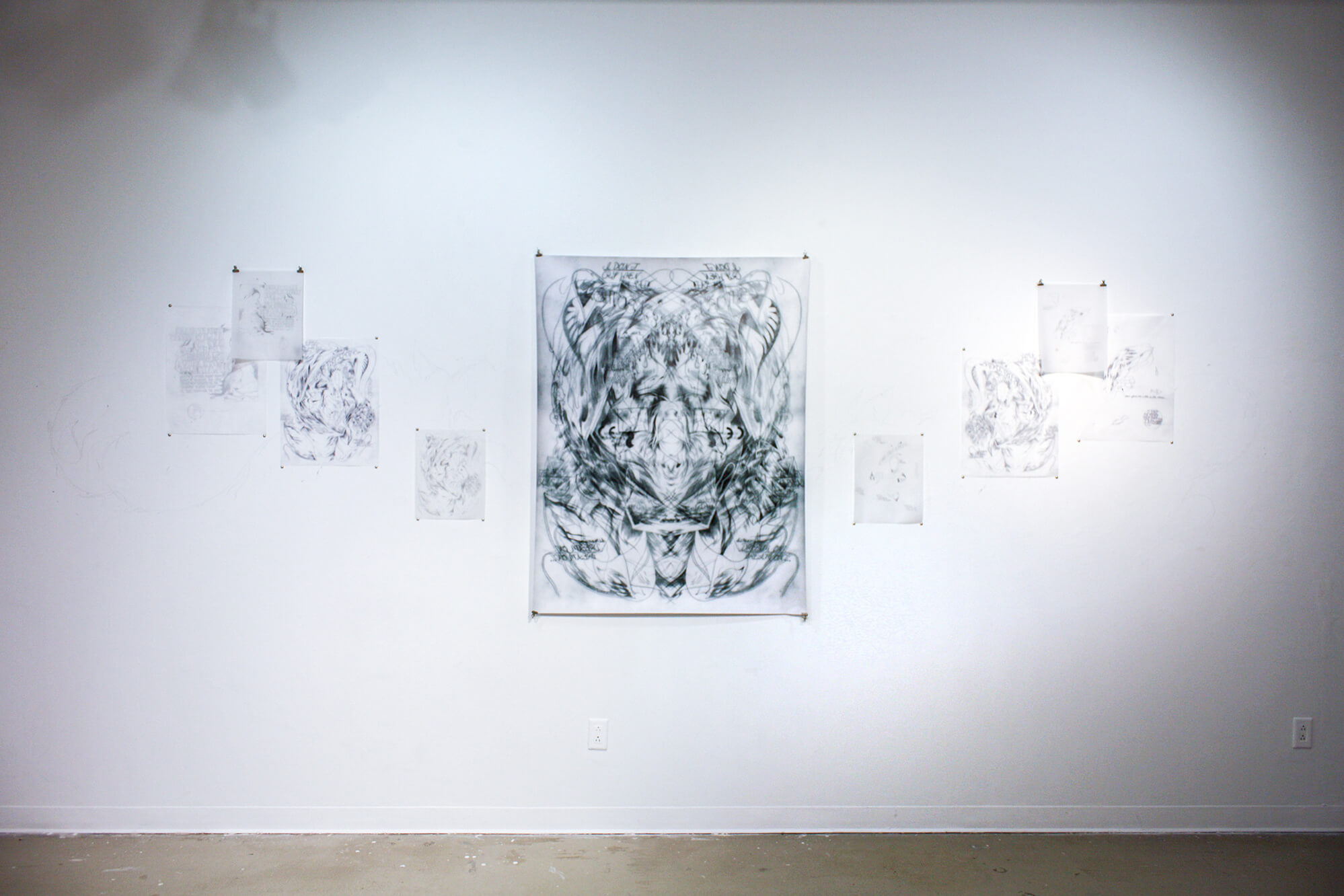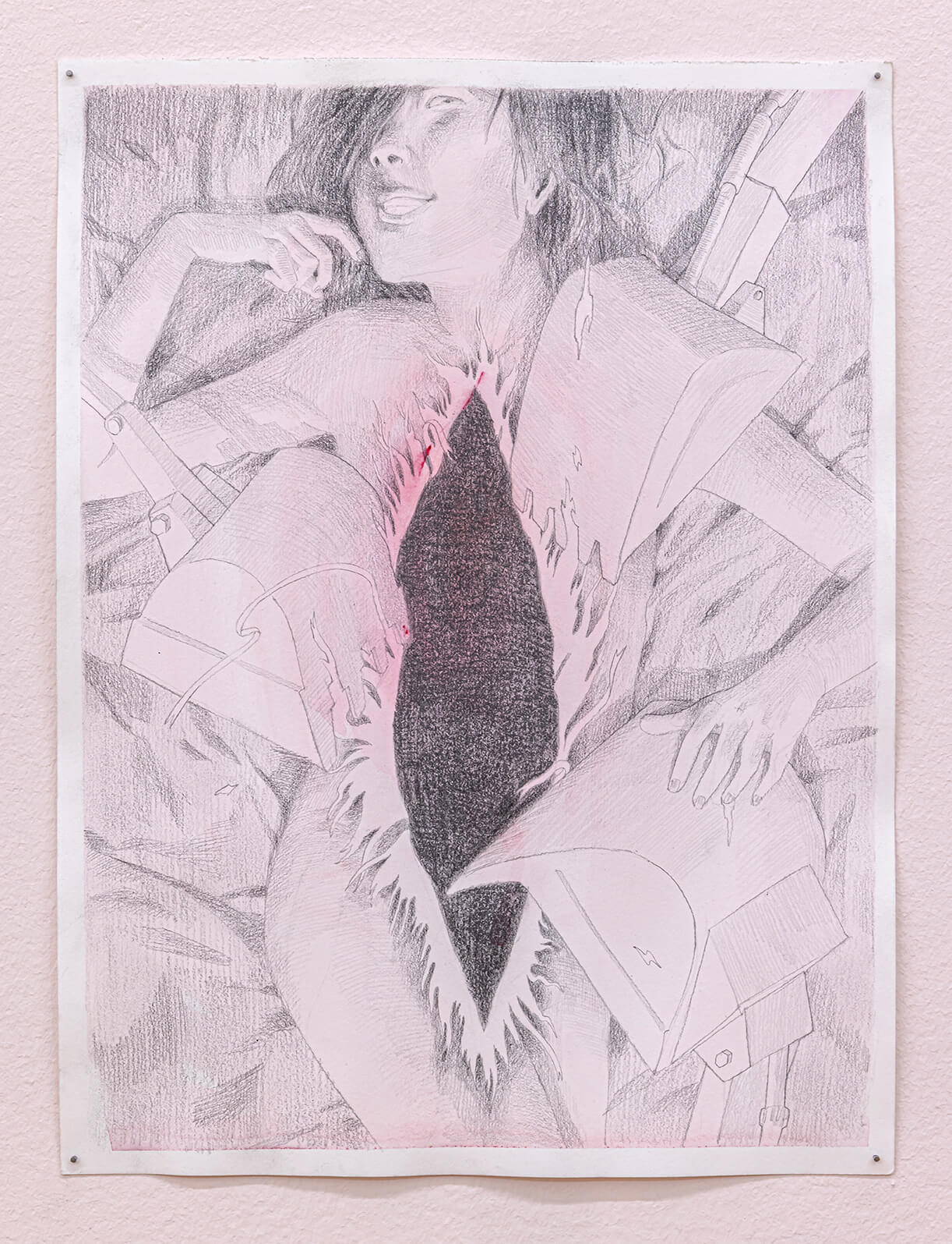 Vinyl text: A Sheathed Abyss uses practices of world-building and feminist myth-making to produce avatars animated by an internal force. This hidden abyss unravels them from the inside out, manifesting as a self-destructive sexuality that destabilizes everything it touches. The avatars are constantly collapsing, melting, and dissolving, often putting themselves in dangerous and masochistic positions, torn apart by an alien desire. The abyss paradoxically consumes and constitutes their being.