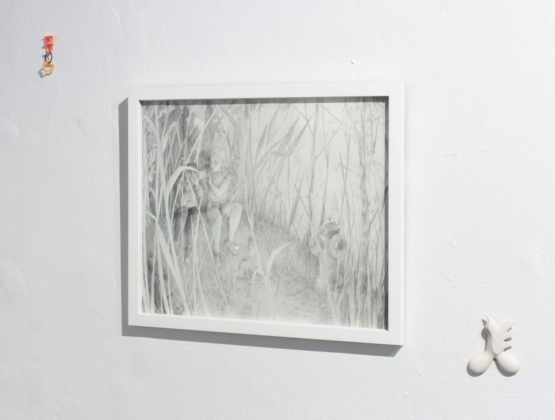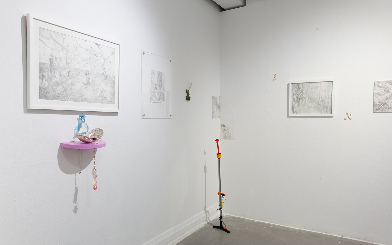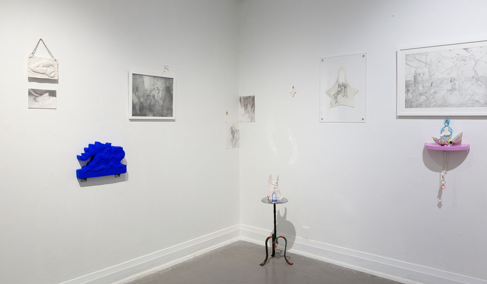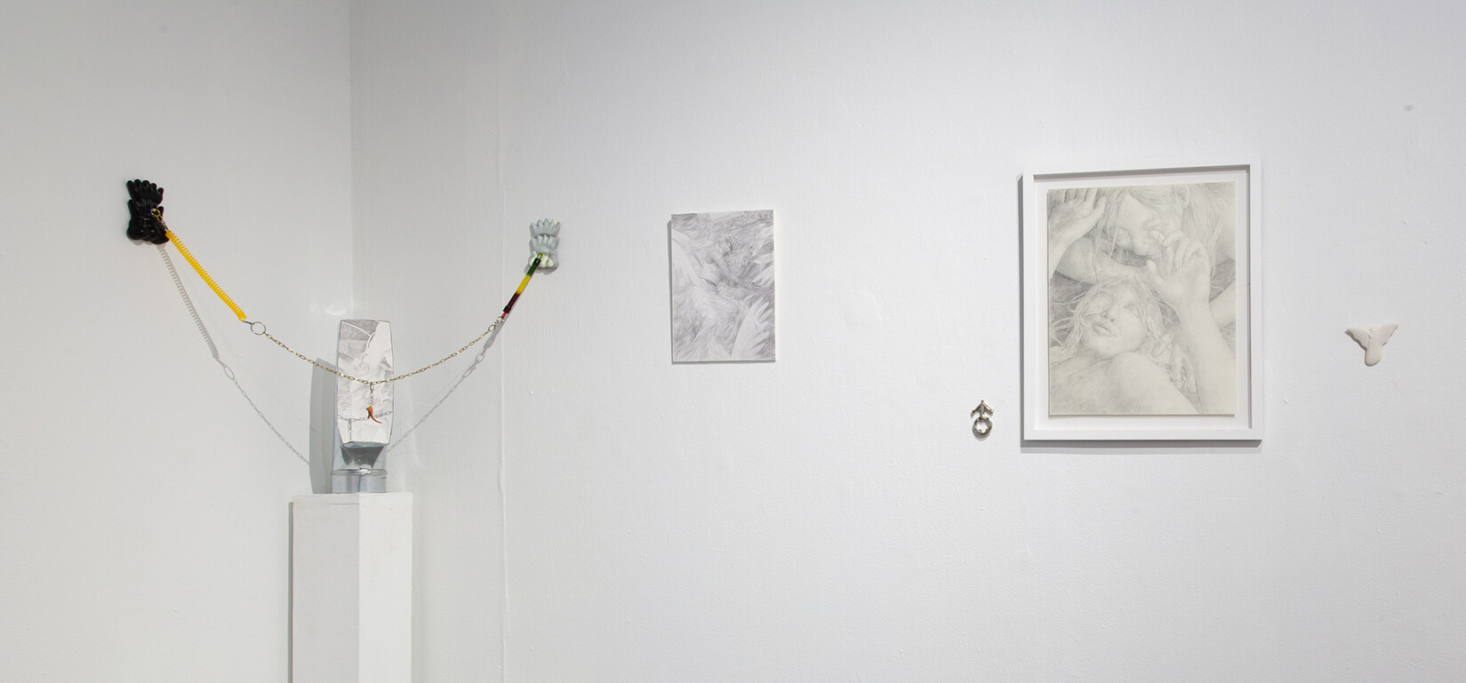 Artist Statement: Dreams and ghosts are held in stasis under a thin veil of amber. Kyle Mowat and Lina Wu employ these dense and materially-oriented processes to populate a world with artifacts re-animated by their own confused histories. Each small detail reveals an underlying strangeness, like facets of a dull gem. Objects become alien, plucked from their original function, material, and location, to serve as vessels exuding new spirits. Drawings and sculptures are corporeal chronicles of the overlapping and peeling away of memory. Creatures and other figurations emerge from semi-fictive tableaux, inviting us to engage with their material intimacy.