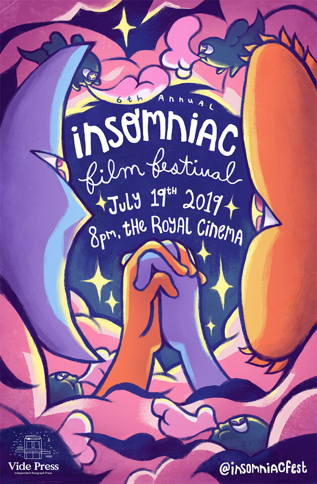 Poster designed in July 2019 for Insomniac Film Festival's 6th edition, for poster and postcard formats (printed by Vide Press).