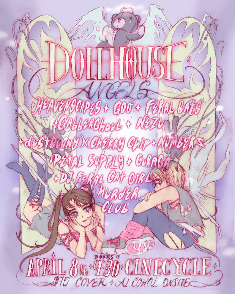Poster designed in March 2022 for now defunct trans rave series Dollhouse, made for Instagram vertical format.