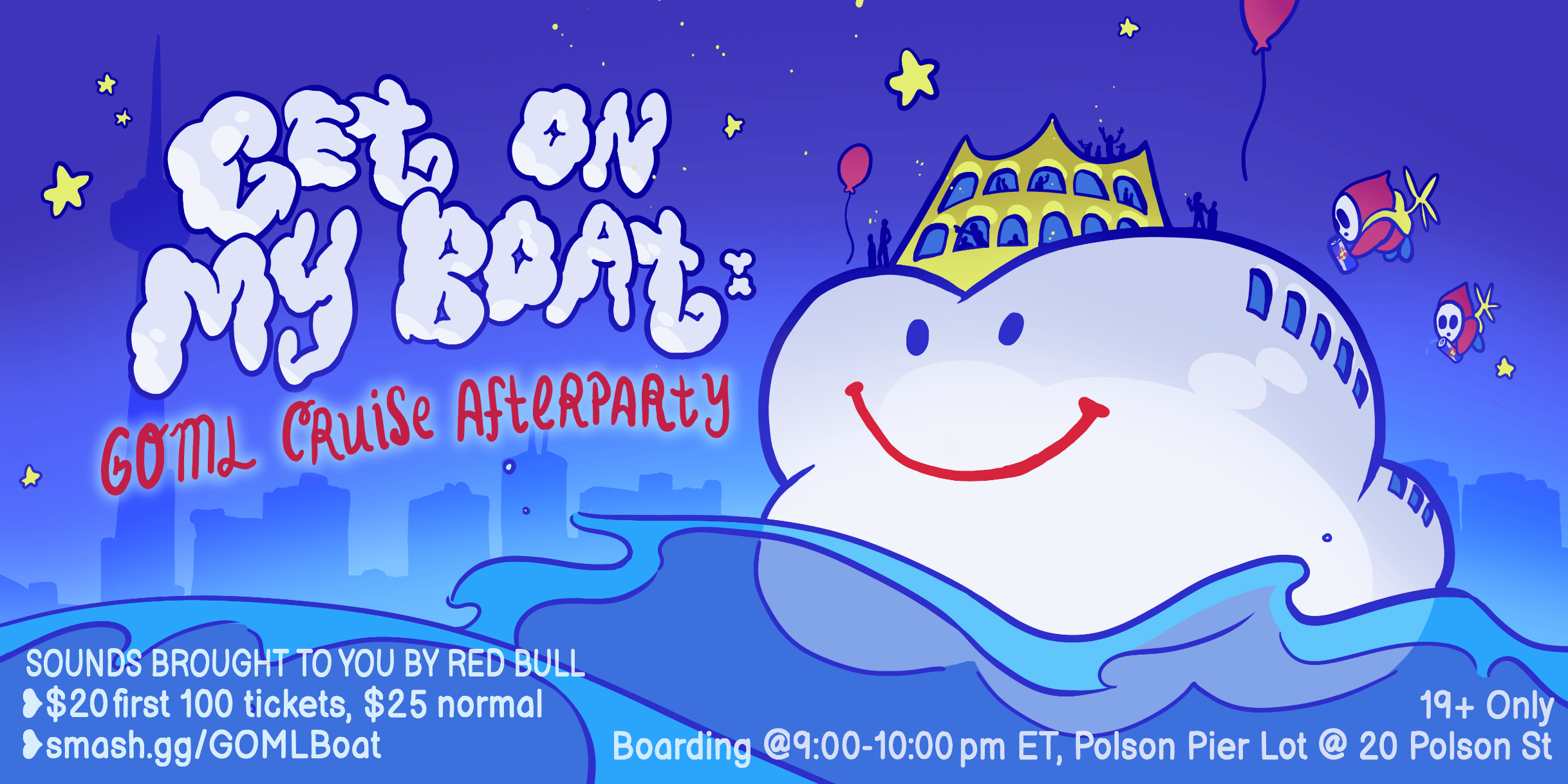 Poster designed in July 2023 for the cruise afterparty celebrating Super Smash Bros. supermajor, Get On My Level. Designed for digital banner format.